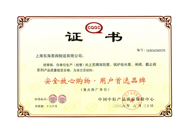 上海东海泵阀制造有限公司:经多年春秋风雨和市场洗礼,正发展成为大规模、集科研、产品开发、制造、销售服务于一体的科研型创新企业。公司2000年率先通过ISO90001国际质量认证,2003年2月又通过了ISO9001 2000版标准认证,2007年1月又通过了ISO2000国际认证,2006年荣获上海市泵阀二十强企业。