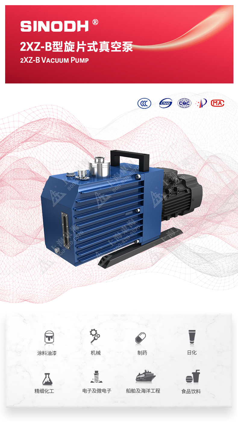 2XZ-B型旋片式真空泵,为上海东海泵阀制造有限公司自主研发生产。本系列产品是用来对密封容器抽除气体的基本设备之一。它可单独作用,也可作为增压泵、扩散泵、分子泵等的前级泵,维持泵,钛泵的预抽泵用。因为它具有体积小、质量轻、操声低等优点,所以更适宜于实验室里使用。